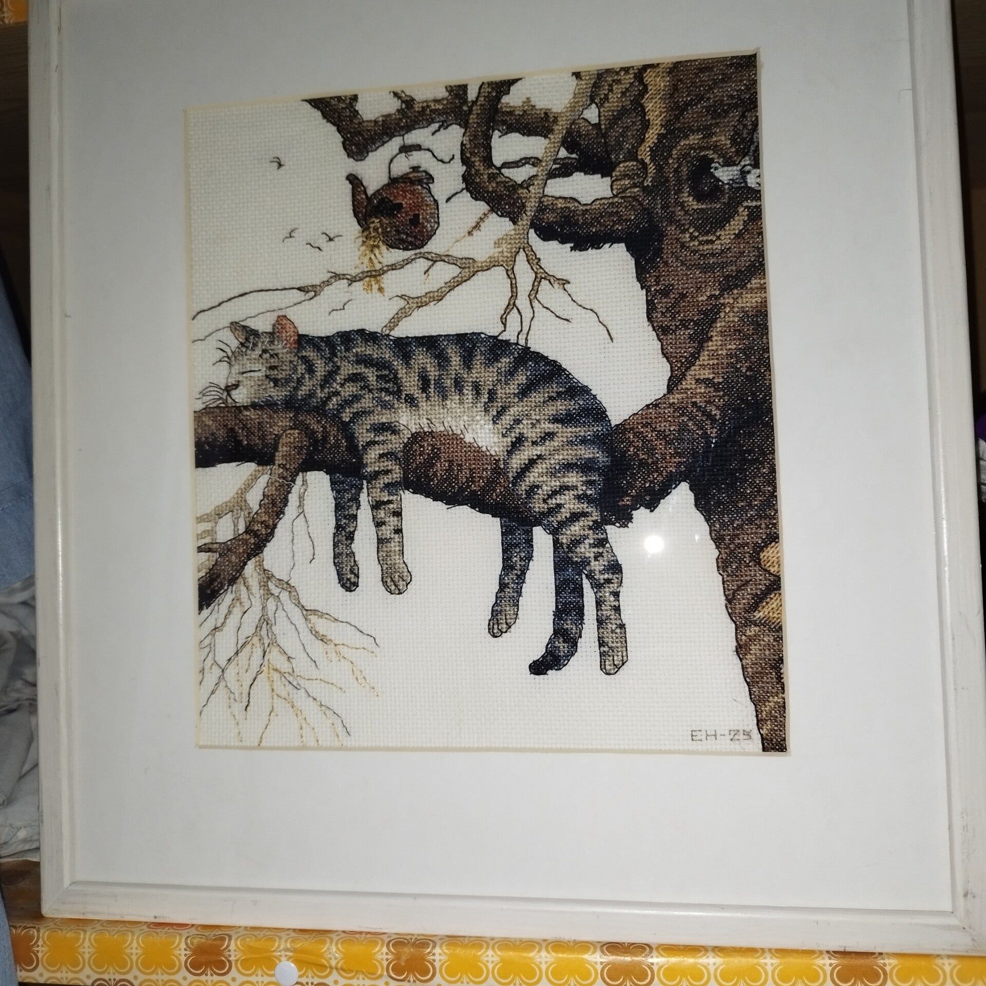 Katt i träd. Inramad vit träram och glas. 35x40 cm.