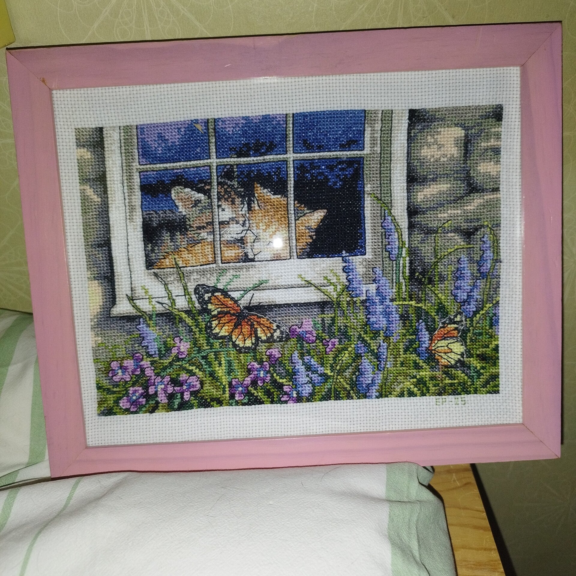 Liten tavla 30x25 cm, handbroderad katter i fönster. Egentillverkad rosa ram.