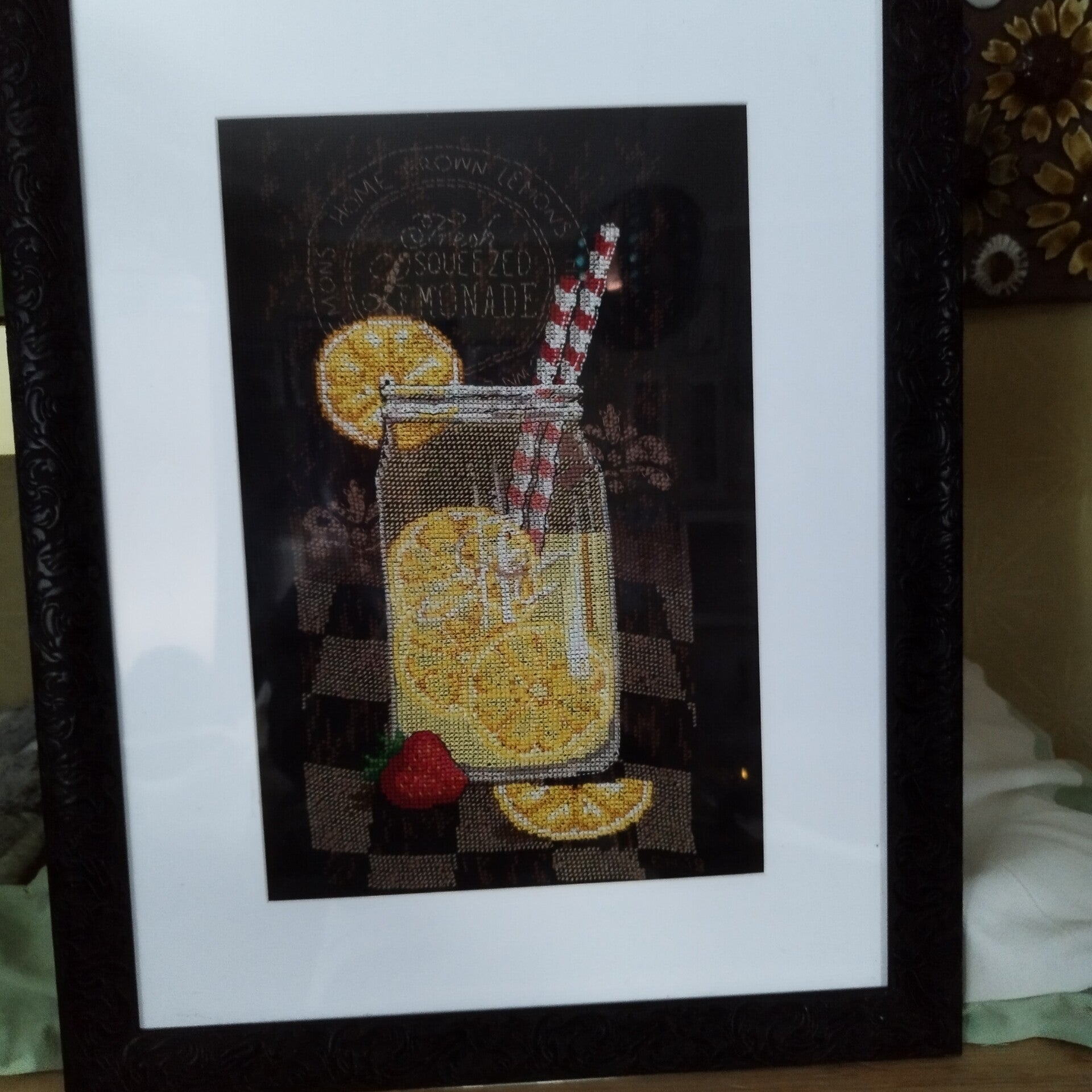 Handbroderad tavla "Lemonade". Inramad med svart mönstrad ram. 30x40 cm