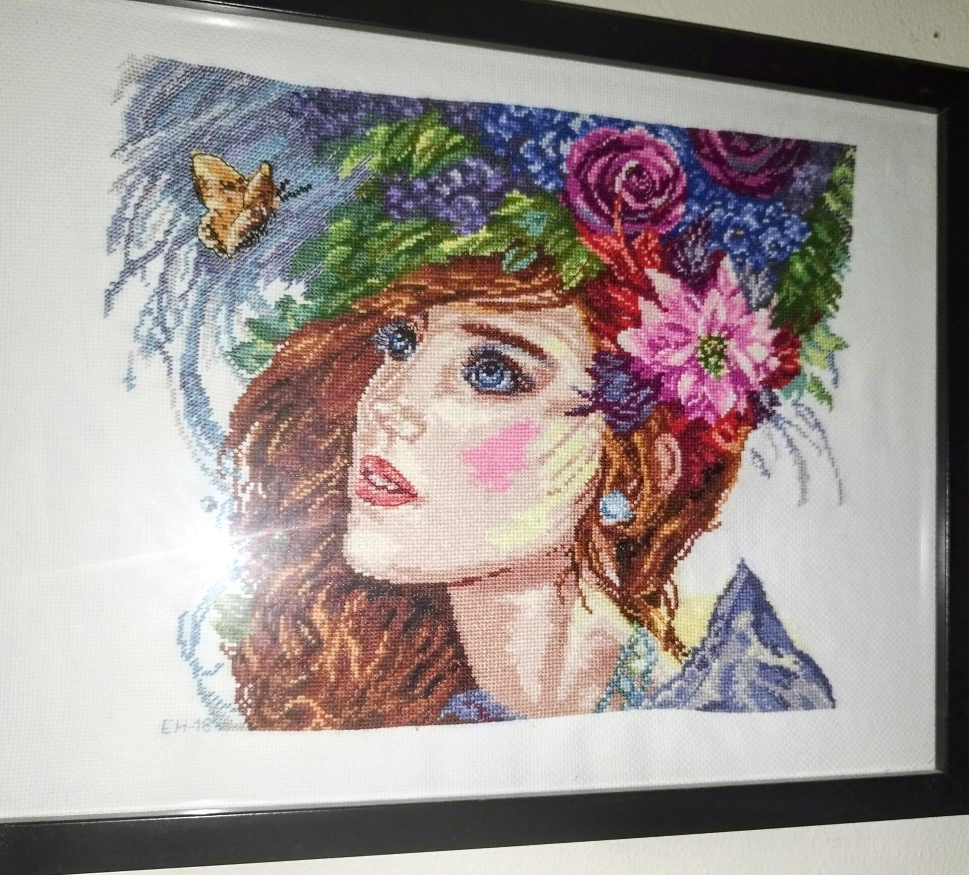 Handbroderad tavla med vacker kvinna med blomster i håret. Färggrann. Strl 40x30 cm.