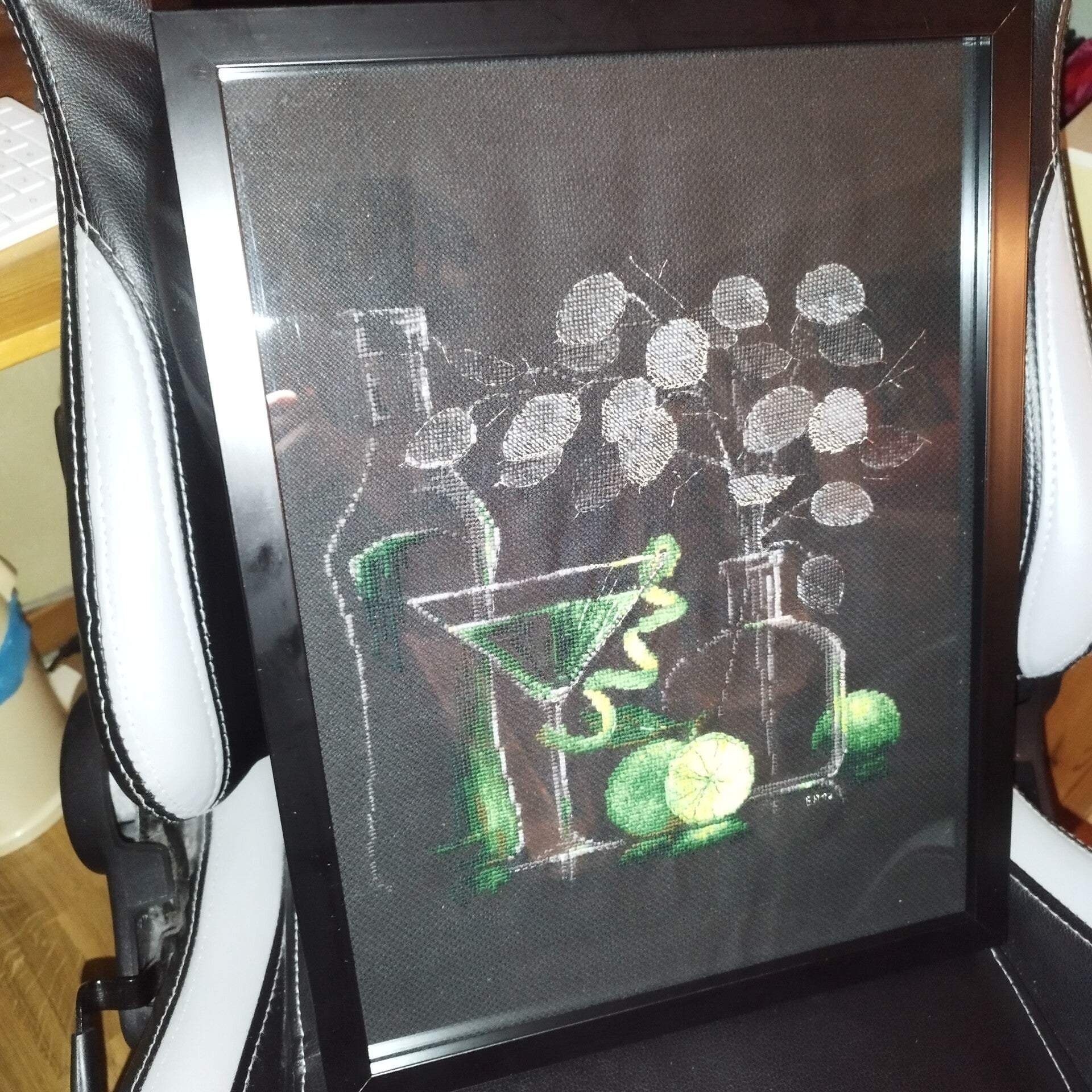 Handbroderad tavla med äpplen och cocktail i gröna färger på svart botten. Strl 30x40 cm. Inramad med svart ram.