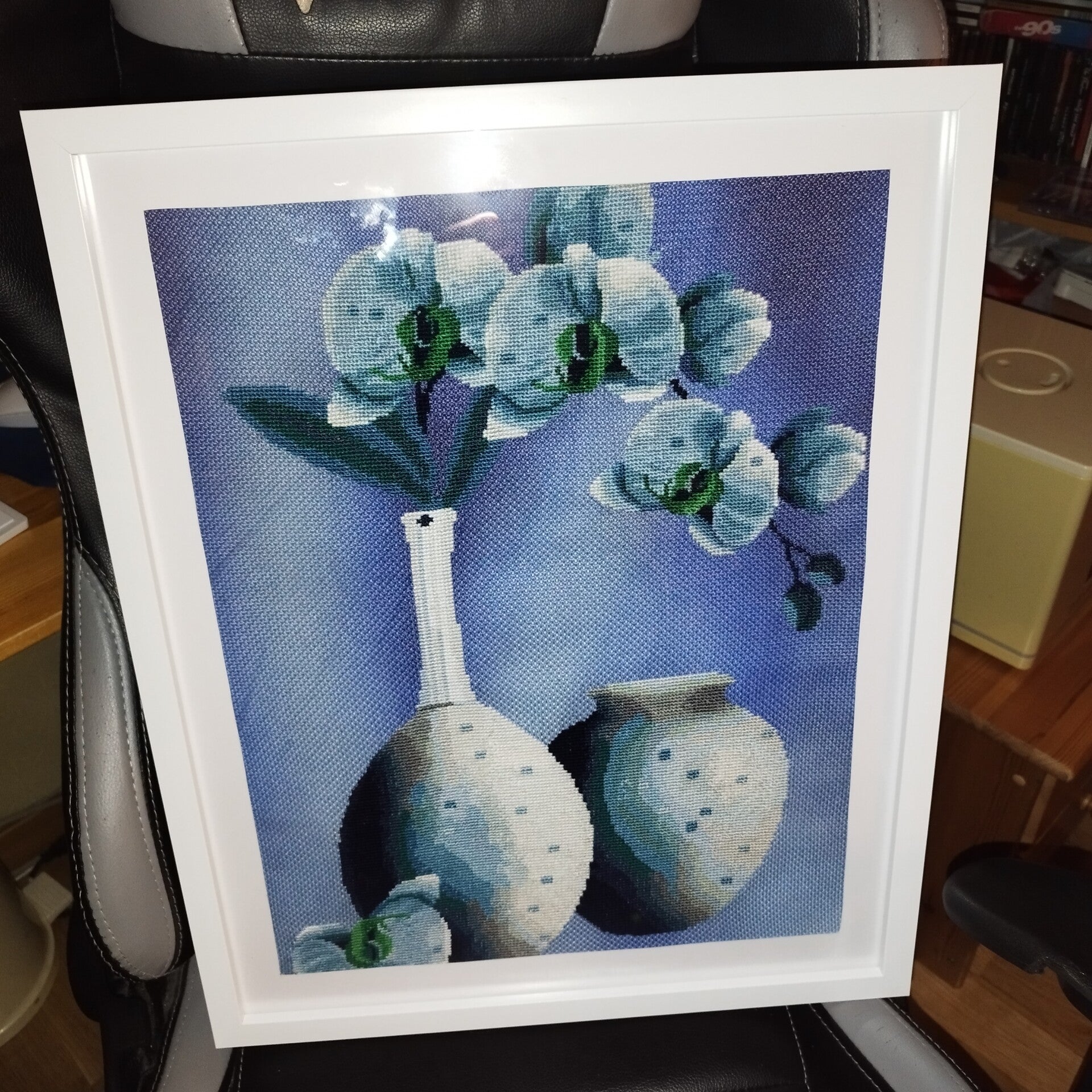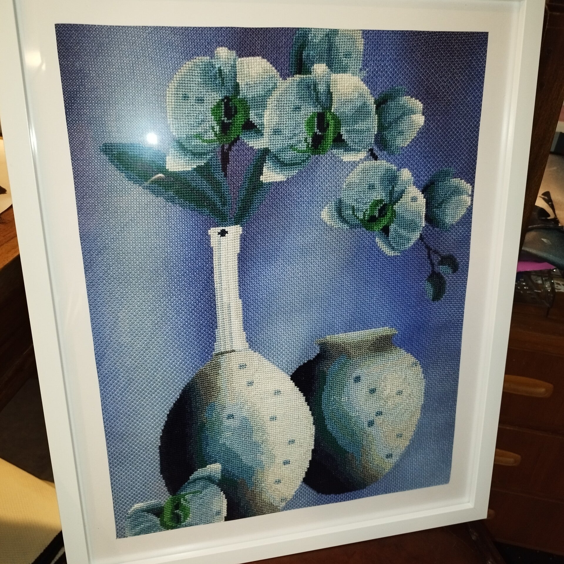 Handbroderad stilfull tavla med blommor i vas. Strl 40x50 cm. Inramad med vit ram.